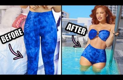 Today, I’m turning old clothes into DIY bardot tops, tie shirts, scrunchies, strappy bikini bottoms, and bandeaus out of leggings